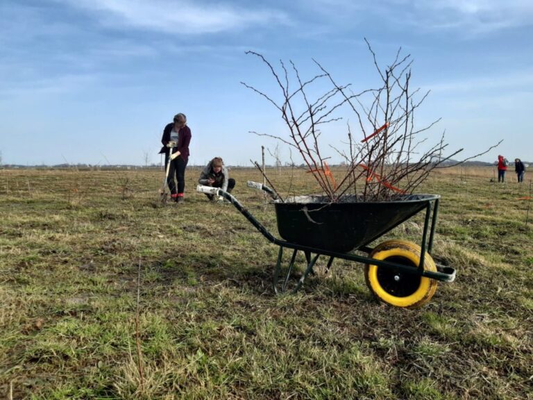 Vanaf woensdag 17 februari tot in april 2021 zijn we namelijk elke woensdag en zaterdag met een grote groep vrijwilligers op een kale modderige vlakte begonnen met het verplaatsen van de inheemse boompjes en struiken naar de hagen en houtwallen rondom GeuzeGroen, het graven van de wadi’s, het weer ophalen bij diverse wijk- en buurttuinen van onze geënte boompjes en het planten van heel veel boompjes en struiken.